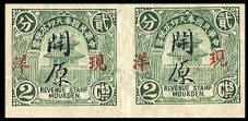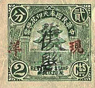 It is possible that the 2c stamps appeared a little later than the 1c blue based on the addition of the 現详Cash Silver overprint. I have one example of the 2c green litho on a document and this is dated 1930, but it is known the red chop was used from at latest mid 1929.. Thanks to Brian Denham for the image of the 2c Green. |