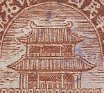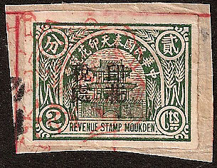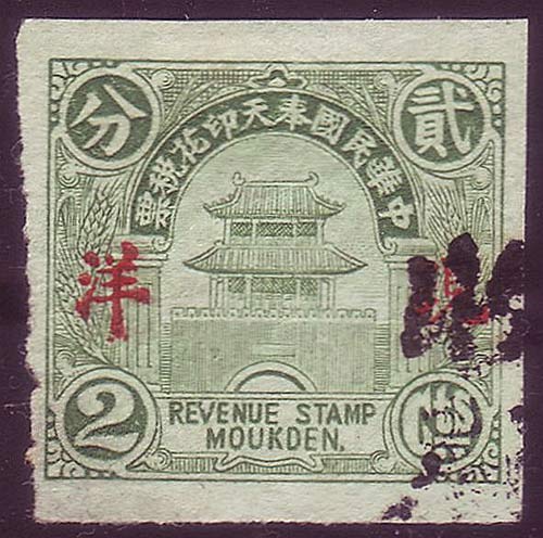 Mukden produced a range of Municipal Revenues they were used to raise taxes for the area, in particular a form of purchase tax and are often found on receipts. The Chinese banner above the gate reads (right to left), Republic of China, Mukden, Revenue Stamp. In addition to the stamps shown below, special municipal taxes were also applied to sales of wine, and a special Mukden wine tax stamp also exists. A common feature of these stamps is the building in the central cartouche, there is some dispute, even in China, about which building this is. Most are certain it is the Drum Tower, others think it might be the North Gate. The Drum Tower was built in 1637 and contained a bell and a drum (and later a clock). The original purpose was as a gateway into the walled town, it also acted as a watchtower to warn of fires within the old city and enemies without. The drum was used to impose a curfew - by the last of the 600 beats of the drum the population must be off the streets. The tower was demolished to ease traffic congestion before these stamps were printed. Postcards of the Drum Tower appear regularly and these images leave little doubt in my mind. The pavilions atop the North Gate have two tiers but are broader, and the same is true of the two tier gate to the Northern Tombs. Background To understand these issues it is necessary to know a little about the history of Manchuria at this time, Shenyang, then Mukden was controlled by the "Old" Marshal 張作霖 Zhang Zuolin (Chang Tso-lin). Zhang started out as a bandit and became a powerful warlord leading a substantial army. He had considerable political influence in China becoming the governor of Manchuria. His base was Fengtian province (today Liaoning), the capital of which was Mukden. In 1920 the economy of Fengtian had all but collapsed due to the need to repay foreign debt, it was at this time Zhang appointed the financially astute Wang Yongjiang to oversee the regional tax office, and later appointed appointed him Director of the Bureau of Finance and Civil Governor of Fengtian province. Wang moved the local currency onto the silver standard, this gave the Fengtian dollar a credibility lacked by other currencies available in China, including that of the national government in Peking and gave it parity with the Japanese golden yen. Looking at the stamps below you will see some overprinted 現详Cash Silver and also see references to 1 dollar, all of these refer to the Fengtian dollar backed by silver. In 1926 Wang and Zhang argued because Zhang needed more money for the military and this drain on the treasury started to undermine the economy. Wang resigned and Manchuria suffered a severe recession. In March of 1926 an acting governor a Mr Hui was appointed, to be replaced in October when the new governor Mr Hiu took office, his principle aim was to keep Zhang's army supplied with money so that he could continue to hold territory South of the Great Wall. The new Governor issued bonds that local businesses were compelled to buy and he also created the revenue stamps shown below. Zhang was assassinated as part of a Japanese plot in June 1928 and replaced by his eldest son (by his official wife), the "Young" Marshall Zhang Xueliang. After the Mukden Incident in September 1931 the Japanese established and controlled The Fengtian Maintenance Committee for Local Autonomy, This committee continued to raise taxes and manage the Mukden/Fengtian economy until 1932 and the formation of Manchukuo. Some of the Mukden Municipal revenue stamps were overprinted at this time and used as provisional issues. To see examples of these stamps in use on original documents click here.