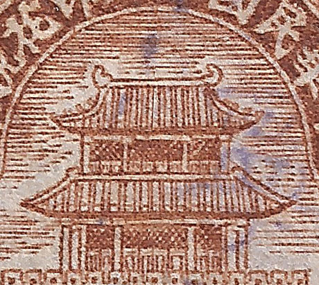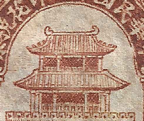 Issued before July 1929, with no lines in the sky behind the Drum Tower, re-touched or new plates made mid 1930 with lines added to the sky (see below). These dates can be confirmed by examining documents here. The blue 1c stamp had probably caused some confusion, 1c revenue stamps had always been brown in the past and it is likely that this was the reason for the change. Litho, Size 20mm x 18mm on thin un-watermarked paper, always imperf. Both issues are always overprinted with 現详Cash Silver (in red). |