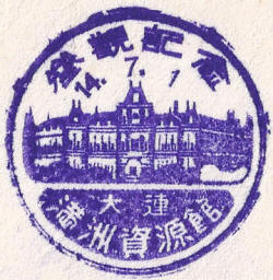1939. Design features - Dairen Manchu Resources (shigen) Hall. Size 43mm dia. Known colours - purple and blue |