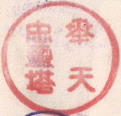 Tourist Cachet - dated 10th May 1936 Beiling 北陵 (Northern tombs), Mukden Size 36mm dia. Known colours - Purple |