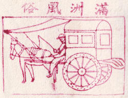 Tourist Cachet - Undated Manchu Customs (possibly a horse drawn taxi). Size 70mm x 52mm. Known colours - Red |