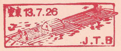 1938. Design features - a raft of logs being guided downriver to the sawmills., The J.T.B. may stand for Japanese Tourist Board, this was a corporation set up in 1912 to look after foreign visitors to Japan. Size 59 x 22mm. Known colours - red |