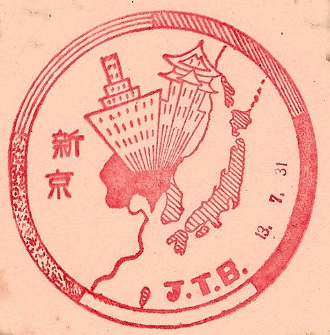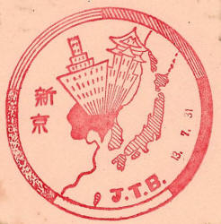 1938. Design features - tall buildings in a map of Manchukuo, the J.T.B. may stand for Japanese Tourist Board, this was a corporation set up in 1912 to look after foreign visitors to Japan. Size 57mm dia. Known colours - red |