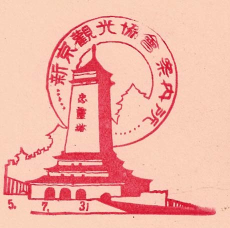 Tourist Cachet - Undated The picture shows the Mukden monument to the loyal dead, The text reads Peiling (Beiling) 北陵 (Northern tombs). Size 63mm dia. Known colours - Red |