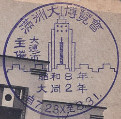 1933. Dairen City - Manchuria Exposition This cancel shows the dates for the exhibition which ran from 23rd July to 31st August 1933. Both the Japanese and Manchurian year date is shown, this is very unusual and may be unique. Size 47mm dia. Known colours - Purple |