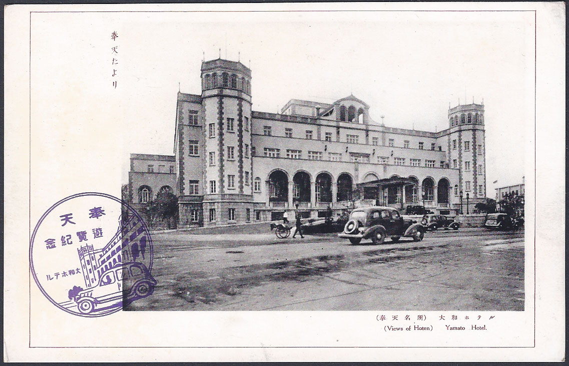 Tourist Cachet - Undated This is the cancel used by the SMR Yamato Hotel featuring the facade of the hotel and a "modern" car. Full image here. Size dia 31.5mm excluding car. Known colours - Purple |