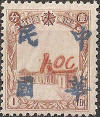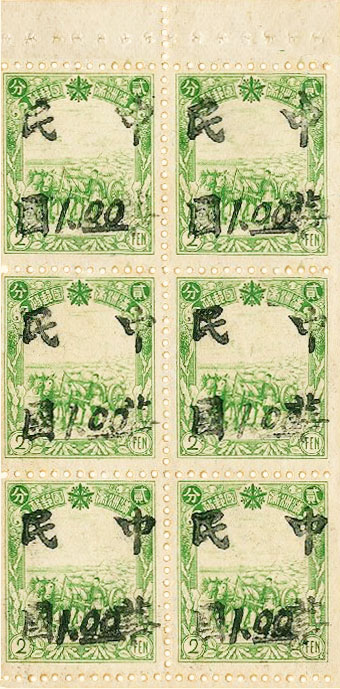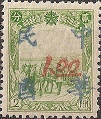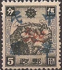 | Surcharges in vermillion with the four character chop shown above. This is a complete set of five stamps. | ||||||||