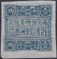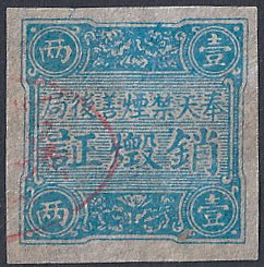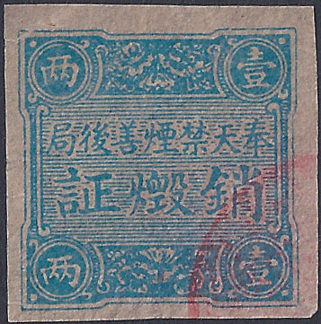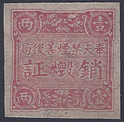 Issued between 1927 and June 1928. Opium became illegal in Fengtian from 1907. It was at this time that Great Britain and China signed a treaty preventing further exports of opium by the British and a ban on domestic production by Chinese growers. This did not stop some growers and dealers from operating a widespread and profitable black market. People at every level of society were known to be abusing the drug. Criminals were making a lot of money and the government was very unhappy about this situation. Zhang Zoulin (1875 ~ 1928), the warlord ruler of the three northern provinces, had from an early stage in his career been a staunch supporter of the ban on opium. However in 1927 he desperately needed to raise money in support of his forces who were under attack by the Nationalist Army's "Northern Expedition" led by Chiang Kai-shek. Reluctantly he decided to raise revenue by exploiting the sale of opium in his power base Fengtian province. To manage this new tax he established the 奉天禁烟总局 best translated as the Fentian (Opium) Smoking General Bureau led by 马义魁 Ma Yi Kui, a Deputy Secretary for the Police Commissioner. This new organisation was based in his capital Mukden and had offices in every town. The plan was simple, he introduced strict controls under the guise of a new tougher crackdown on the opium trade. He would enforce the ban by the use of financial penalties - these were, in fact, a thinly disguised tax. The Fengtian opium traders were quick to realise that the government simply wanted money and so they came forward to voluntarily purchase "Opium Destruction Certificates". Many growers stopped growing opium thinking that a genuine ban was in force, until officials visited them and explained that they continue to grow opium on payment of a 30 Yuan "penalty" per acre or field. To help the crackdown along it is said that seed was even available from the local office. It became a punishable offence to smoke opium unless you were a recovering addict. If you wanted to continue to buy opium you had to claim to be a recovering addict. As an addict you had to pay 20 Yuan to buy an "abstain certificate" this allowed you to buy opium for one month. A time limit for recovery from addiction was laid down dependent upon the age of the "addict" however, this was largely ignored so long as the addict could afford to buy another certificate. Pharmacies often provided a special room for the smoking of opium, these were also subject of a special "penalty" which was in effect a license. Some of the poorer people did have to stop taking opium but realistically the whole clampdown was a sham. Most forms of taxation at that time involved a tax stamp and opium was no exception. In this instance dealers were charged a penalty of 2 Yuan for each "两" Liang (or Tael), approximately 50g sold. These destruction certificates (tax stamps) are said to have been available in denominations 1 Yuan, 2 Yuan, 5 Yuan and 10 Yuan. Of these, only the blue 1 Yuan stamp appears to survive, so it is that possible the other denominations were planned but not issued. I have been unable to find any details of these missing values concerning colour or design. Design size 44mm x 19.5mm, Lithographed on thin white un-watermarked paper (possibly cigarette paper). The design features an image of the drum tower gate with sheaves of wheat on either side. This reflects the style of the municipal revenue stamps issued in Mukden from 1926 until 1932. The banner at the top of the stamp reads 奉天禁烟总局销毁证 Fengtian (Opium) Smoking General Bureau, Destruction Certificate, with the value of 1 Yuan shown at each end of the stamp within a circular motif. Allowing the sale of opium led to many members of the workforce becoming addicted and productivity suffered as a result. The policy did not raise as much revenue as expected and Zhang was criticised by both the Chinese and foreign powers for bad policy. The use of these stamps came to an end when Zhang Zoulin died in June 1928 and was replaced by his son, Zhang Xueliang. He, once again, made the sale of opium illegal and abolished the bureau.