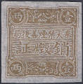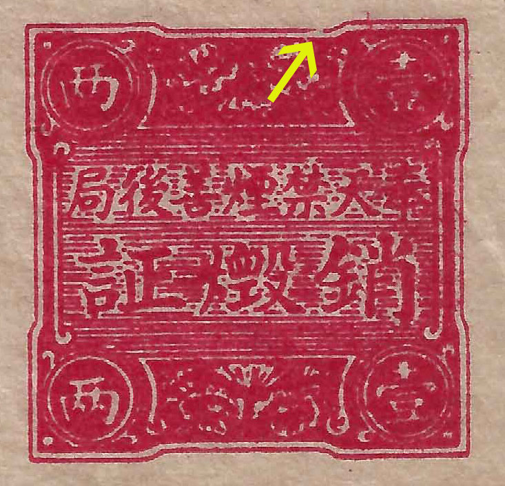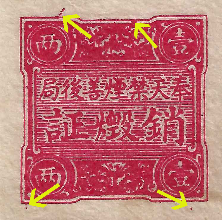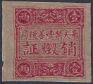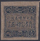 Some stamps are found with a red oval cancel. This is usually feint and unreadable, it may simply be the mark of a retailer or it could be more official. It is probably a readable example of this exists somewhere and when a translation can be obtained it will hopefully answer this question. |